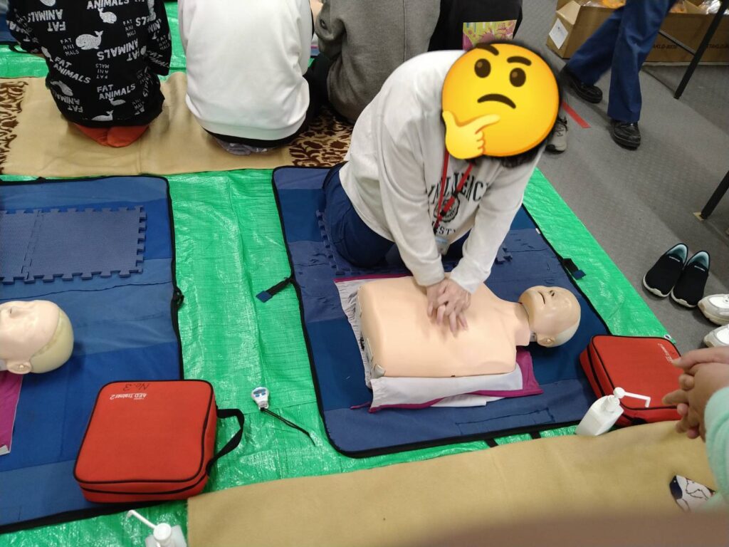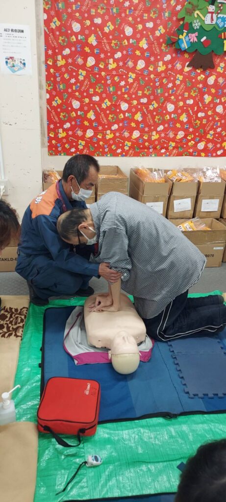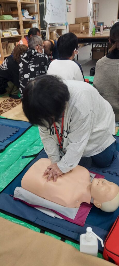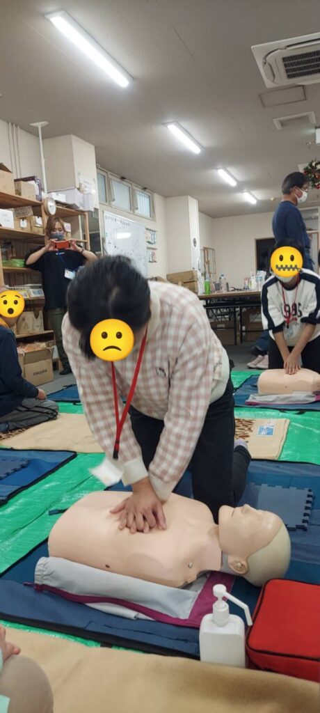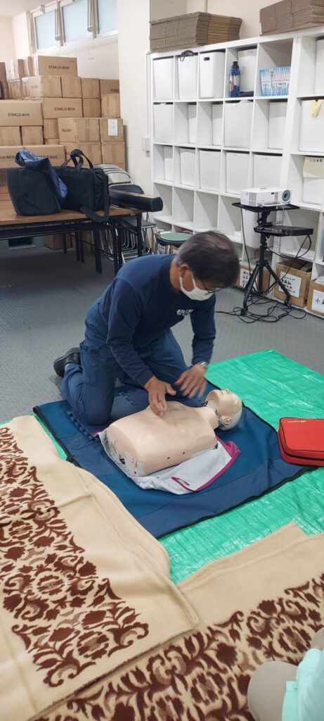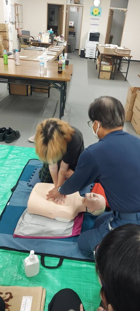 最初に救命訓練に関するDVDを視聴し、その後に数人一組でグループ毎にマネキン人形とAEDの機械を使用し、訓練を行いました🙂